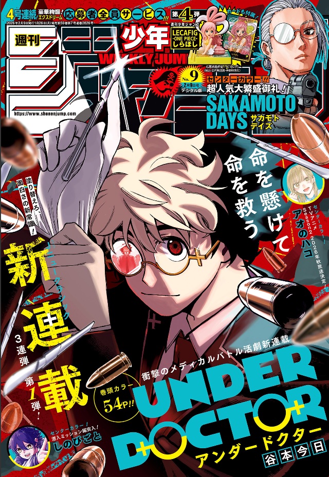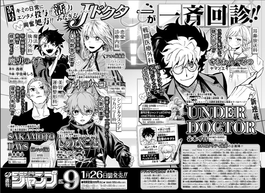 【1/26販売】週刊少年ジャンプについて 漫画・アニメ X Facebook LINE コピー 2026.01.26 1月26日販売の週刊少年ジャンプ9号の総評と公開された情報をお話していきます!! 目次 1月26日販売 週刊少年ジャンプ9号 情報総評 1月26日販売 週刊少年ジャンプ9号 情報 "引用 少年ジャンプ 9 号より" 新連載「UNDER DOCTOR」 休載情報「ONEPIECE」 掲載順UNDER DOCTORウィッチウォッチ魔男のイチさむわんへるつSAKAMOTODAYS呪術廻戦モジュロカグラバチしのびごとあかね噺悪祓士のキヨシくん逃げ上手の若君アオのハコ鵺の陰陽師ひまてん!僕とロボコJK勇者と隠居魔王隣の小副川ゴンロン・エッグハルカゼマウンド ※連載終了ルリドラゴン ※定期購読者のみ 総評 "引用 少年ジャンプ 8号より 総評 今週はワンピースがお休みです。今月は2週分?しか読んでない気がw1月も終わりに近づいてきて連載終了と新連載スタートと入替が激しくなってきています。これがジャンプのいいところでもあり、悪いところでもある。。。連載終了した作品がよりパワーアップして帰ってくることを毎回願っています。 今回も、とくに印象に残った作品(4部)を紹介します。 『UNDER DOCTOR』 新連載の医療?暗殺者?漫画です。とにかく引き込まれました。新連載のスタートしてはかなりすごい内容となっています。バトルシーンもあるし、医療のお話など、ダークヒーローみたいなそんなストーリーになればめちゃくちゃ盛り上がる漫画だと思います!過去のジャンプにはないジャンルです。 『アオのハコ』 幼馴染3人の話が現在進んでいます。過去と現在で大人になって成長していく3人ですが、関係性が少し変わってきているのを3人とも感じています。それぞれの想いが交錯していきますが、一番はこの関係は一生の宝物し、恋人や友達とはまた違う信頼関係で繋がっている。。。心がきゅっと苦しく甘酸っぱくなるなる内容となっています。 『SAKAMOTODAYS』 いよいよ坂本さんのバトルが開始されました。昏睡状態からの復活で、いきなり大ボスと戦うなんて。。。しかもぽっちゃりモードでwwかっこよすぎる!この生き様に惚れてしまいますね!家族や仲間のためにどう戦っていくのかここから目が離せません!! 『ハルカゼマウンド』 えっ?連載終了なの?とめちゃくちゃ残念でした。甲子園にいくために集められた異端児たち!1年生の新チームでこれから面白くなるのにと大いに期待していた漫画だったので悲しいですね。画風もとても見やすかったし、野球に詳しい人が監修しているのかな?と思えるくらい最近の高校野球の状況を説明してくれていた気がします。今後の作品もぜひ野球関係で書いてくれたらうれしいな。。。 今週末にONEPIECEBaseSHOPとドラゴンボールゲンキダママツリにいっていきました。ジャンプの2大看板漫画に触れることができて充実した2日間でした!またレポート書きたいと思います。 来月は銀魂の映画もやるし。。。ジャンプ作品は私の心を休ませてくれませんねwww 今週号もぜひ読んでみてくださーい。
