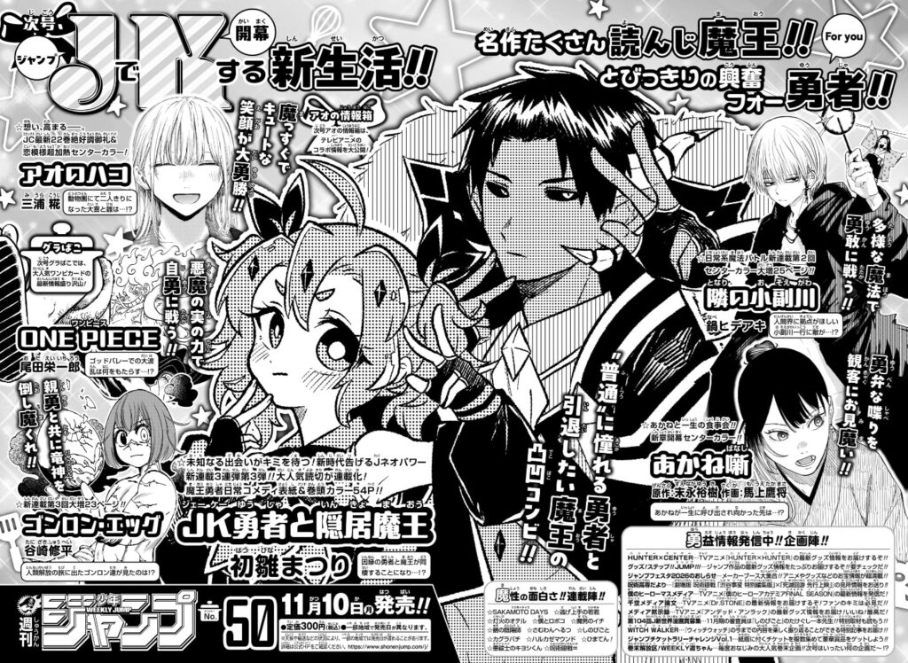 【11/10販売】週刊少年ジャンプについて 漫画・アニメ X Facebook LINE コピー 2025.11.10 11月10日販売の週刊少年ジャンプ50号の総評と公開された情報をお話していきます!! 目次 11月10日販売 週刊少年ジャンプ50号 情報総評 11月10日販売 週刊少年ジャンプ50号 情報 "引用 少年ジャンプ 50号より" 新連載「JK勇者と隠居魔王」 休載情報「ウィッチウォッチ」 掲載順JK勇者と隠居魔王呪術廻戦モジュロONEPIECEさむわんへるつ隣の小副川魔男のイチSAKAMOTODAYSゴンロン・エッグあかね噺しのびごと鵺の陰陽師アオのハコ悪祓士のキヨシくんひまてん!僕とロボコカグラバチ逃げ上手の若君灯火のオテルハルカゼマウンド 総評 "引用 少年ジャンプ 49号より 総評 今週号のジャンプはウィッチウォッチがお休みです。そして今回はめっちゃいいニュース!!ジャンプフェスタ26の午後券が先着で募集するとのこと!今週はずれたらどうしよ。。。。と考えていた私ですがこれで少し安心しましたwwwでもあたってほしい!! また、ONEPIECE海賊無双4(ゲーム)の新情報やグッズ関係の情報が盛り沢山の50号となっています。海賊無双ではジュエリー・ボニーが参戦!!ますますテンションが上がりますね! 今回も、とくに印象に残った作品(4部)を紹介します。 『ONEPIECE』 ゴットバレー事件の全貌がついにあきらかになりました。正直、泣いた。。。ロックスやガープ、ロジャーの人間性には本当に学びがあり、尊敬に値します!!20年近い伏線の回収劇には本当に心躍ります。来週はお休みとのことですので、ぜひ今週号を読んで楽しんでほしいです。 『JK勇者と隠居魔王』 読切掲載からここにきてやっと連載がスタートしたJK勇者と隠居魔王です。普通に暮らしたい魔王と勇者の同居生活がスタートします。同居生活でのハラハラドキドキする展開に今後も期待です。のびのびした雰囲気もまさに癒しになります。 『逃げ上手の若君』 愛の告白をした弧次郎の男を上げるための戦いが始まりました。戦国自体は戦うことで武勲を上げて妻をもらう。。すごい文化が日本にはあったのかと感銘を受けました。その分、戦いを待つ妻。。。勉強になりました。 『ハルカゼマウンド』 練習試合もある程度終わり、いよいよチームのレベルアップを求め練習が開始されます。そこに新たなコーチが現れチームを指揮いていきます。今後、個々のレベルはどうなるのか!?チームは甲子園に行けるのか?楽しみです。※連載終了とかやめてよ!?応援してます! 今週号もぜひ購読して読んでみてくださーい。 いよいよ11/14はジャンフェス合否発表です。午後券が発表されたけど、朝からいきたい。。。神様お願いします。あっドラゴンボール”ゲンキダマツリ”に当選しました。年明けに開催するのでまた、レポートします!