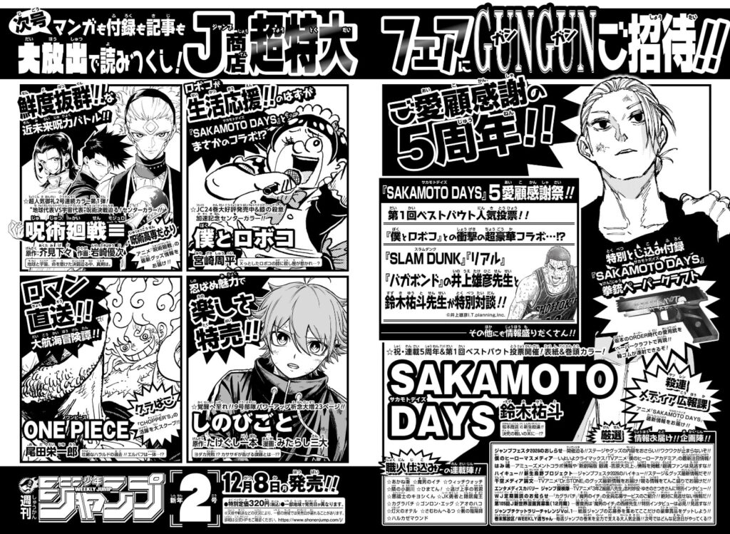 【12/8販売】週刊少年ジャンプについて 漫画・アニメ X Facebook LINE コピー 2025.12.08 12月8日販売の週刊少年ジャンプ2号の総評と公開された情報をお話していきます!! 目次 12月8日販売 週刊少年ジャンプ2号 情報総評 12月8日販売 週刊少年ジャンプ2号 情報 "引用 少年ジャンプ 2 号より" 新連載「なし」 休載情報「なし」 掲載順SAKAMOTO DAYSさむわんへるつONEPIECE呪術廻戦モジュロあかね噺魔男のイチウィッチウォッチ逃げ上手の若君しのびごとJK勇者と隠居魔王アオのハコゴンロン・エッグ僕とロボコ隣の小副川悪祓士のキヨシくんカグラバチひまてん!鵺の陰陽師灯火のオテルハルカゼマウンド 総評 "引用 少年ジャンプ 2号より 総評 今週のジャンプは面白企画があります。SAKAMOTODAYSの拳銃ペーパークラフトがついています。子どもたちがめちゃくちゃ喜びそうな企画ですね!さらに第1回ベストバウト投票が開始されました。投票することで抽選で豪華賞品があたるかもしれません!! そしてなによりもあの「スラムダンク」の作者(井上井上雄彦先生)と「SAKAMOTODAYS」の作者(鈴木祐斗先生)が特別対談したそうです!豪華すぎます! 今回も、とくに印象に残った作品(4部)を紹介します。 『ONEPIECE』 ゴットバレー事件が終わりいよいよエルバフ編の現在につながる話になってきました。シャンクスが・・・ハロルドが・・・もう来週が休載なのが辛すぎます。。。 『SAKAMOTODAYS』 少しネタバレしますが、やっと・・坂本さん復活します。とんでもない日本になってしまった状況で坂本さんがどうやって救っていくのか!!ここから反撃開始ですね。 『僕とロボコ』 今週の僕とロボコはまたやってくれましたwwSAKAMOTODAYSとコラボしています。そしてさらに画風が途中でSAKAMOTODAYSになっています。というより鈴木先生が書いています。最高のコラボをありがとうございますwww 『JK勇者と隠居魔王』 勇者の友達作りの話です。魔王の完璧さが逆にストーカーじみてて最高に笑えます。そして勇者のために尽くす魔王がなんかいい!!心温まる話です。友達作るって本当にタイミングや勇気が必要ですよね! 今週号もぜひ購読して読んでみてくださーい。 報告でONEPIECE BASE SHOP 新宿店に1月下旬に行きます。抽選予約できました。来店したらまたブログで報告したいと思います。お金足りるかな。。。今月はジャンプフェスタ26、銀魂展とイベントたくさん参戦するので楽しみにしていてください。