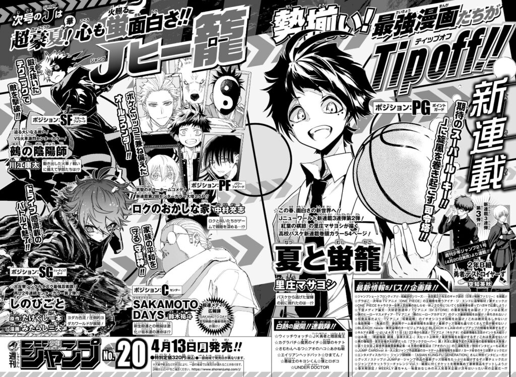 【4/13販売】週刊少年ジャンプについて 漫画・アニメ X Facebook LINE コピー 2026.04.13 4月13日販売の週刊少年ジャンプ20号の総評と公開された情報をお話していきます!! 目次 4月13日販売 週刊少年ジャンプ20号 情報総評 4月13日販売 週刊少年ジャンプ20号 情報 "引用 少年ジャンプ 20号より" 新連載「夏と蛍籠」 休載情報「ONEPIECE」 掲載順 夏と蛍籠 魔男のイチ SAKAMOTODAYS ロクのおかしな家 さむわんへるつ 悪祓士のキヨシくん しのびごと アオのハコ カグラバチ 鵺の陰陽師 ウィッチウォッチ あかね噺 僕とロボコ エイリアンヘッドバッド ひまてん! UNDER DOCTOR 回撃のキナト 日常!!戦隊ファミリー JK勇者と隠居魔王 ※最終回 総評 "引用 少年ジャンプ 19号より 総評今週のジャンプはONEPIECEがお休みです。先週ついにイム様が現れてXでは憶測がとにかく飛び回りました。私も1週間近くもやもやまだしてそうですwwwあかね噺のOPにサザンオールスターズの桑田佳祐さんと前回紹介しましたが、なんとEDも桑田佳祐さんでした。私がする限りジャンプ漫画でOPとEDダブルは数少ないと思います。さすがですね!!今週のおすすめ4作品を紹介します。『魔男のイチ』男だけの集団、マジキーパー(魔女犯罪対策本部)という組織が登場し、新たな風が吹きそうな気配があります。そんな組織の中に、イチの知り合いが。。。魔女VS男の戦いになるのか!?新展開に期待です!『SAKAMOTODAYS』今週号読んでシンプルに神々廻と大佛さんが死ななくてよかった。。。この2人が抜けたり、どっちかかけたらかなり落ち込みますねw最近のSAKAMOTODAYSはずっと目が離せないバトルで主要キャラがいつ死んでもおかしくない状況です。あと、実写版の大佛さんはめるるさんとのことです。美人すぎる!!『しのびごと』ヨダカの独り言の回ですww純粋に読んでてえっだれと会話してるのとつっこみしたくなりますが、そこが最高です。そしてあのヨダカに合理的思考が。。。成長って怖いなwww『夏と蛍籠』新連載で、久しぶりのバスケ漫画です。前少し読切で掲載された漫画がついに連載開始しました。簡単に説明すると弱小高校に入った天才とその天才につられて入部した天才がコンビを組み高校バスケを席巻するという漫画です。これからどうなっていくのか楽しみです。タイプ的には黒子のバスケに近いかな?今週号もぜひ読んでみてくださーい。