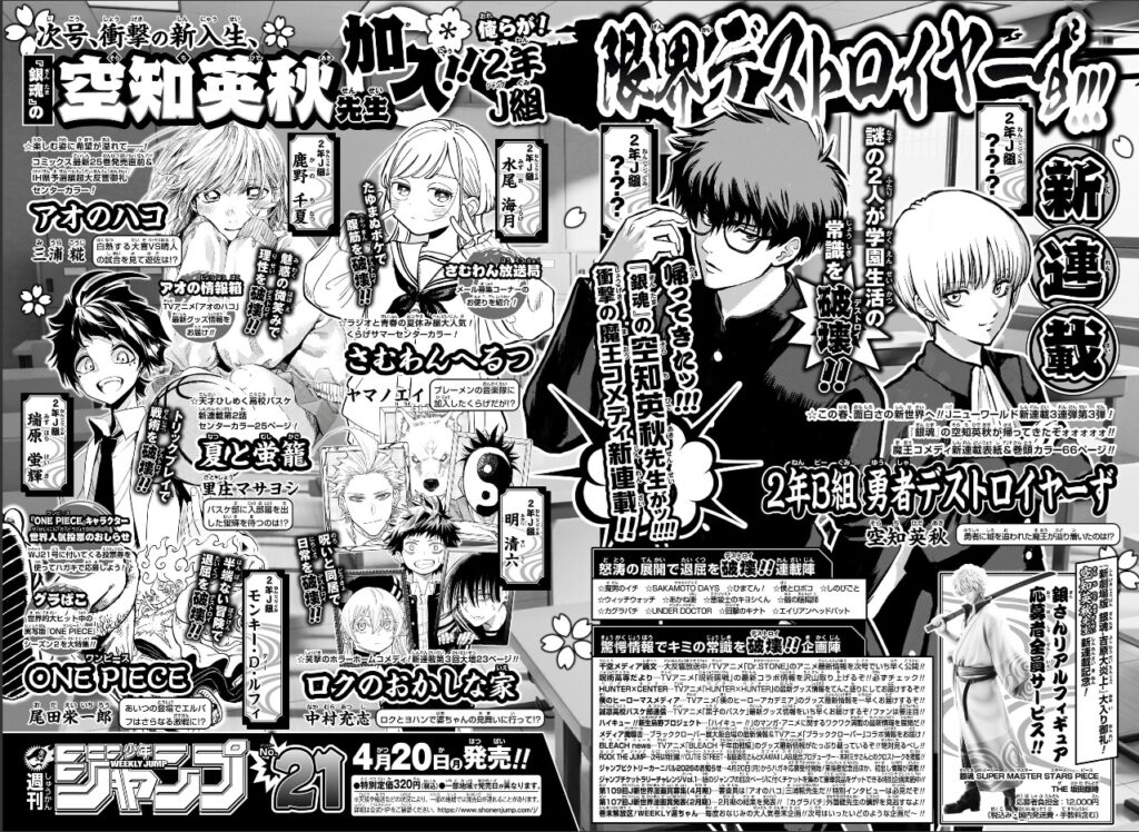 【4/20販売】週刊少年ジャンプについて 漫画・アニメ X Facebook LINE コピー 2026.04.20 4月20日販売の週刊少年ジャンプ21号の総評と公開された情報をお話していきます!! 目次 4月20日販売 週刊少年ジャンプ21号 情報総評 4月20日販売 週刊少年ジャンプ21号 情報 "引用 少年ジャンプ 21号より" 新連載「2年B組 勇者デストロイヤーず」 休載情報「なし」 掲載順2年B組 勇者デストロイヤーずONEPIECE魔男のイチSAKAMOTODAYS夏と蛍籠ウィッチウォッチしのびごとさむわんへるつロクなおかしな家あかね噺アオのハコ悪祓士のキヨシくんUNDER DOCTORカグラバチ鵺の陰陽師ひまてん!僕とロボコ回撃のキナトエイリアンヘッドバッド 総評 "引用 少年ジャンプ 20号より 総評 今週のジャンプはとにかく情報量が多すぎでした。一番の目玉はジャンプジャンプビクトリーカーニバル2026の参加募集がスタートしました。はがきでもWEBでも応募が可能です。昨年は参加できなかったので今年こそは三参加したいな! そして応募者全員サービスの銀魂の「銀さんリアルフィギュア」です。とにかくかっこいい。。。渋い!金額が1万2千円と少しお高いですが、かなりのプレミアムな商品だと思います。 SAKAMOTODAYS実写版の坂本葵さん役が上戸彩さんに決まりました。似合いすぎる。。。楽しみすぎますね! 今週のおすすめ4作品を紹介します。 『2年B組勇者デストロイヤーず』 あの銀魂の空知先生待望の新連載です。とにかく空知節がさく裂しています。内容はなんていうんだろ。。。ファンタジー?ギャグ?表現が難しいですが、笑いのセンスだけは本当にすごいです。マジで笑えます!しょっぱなからうん〇ネタだとかは言えませんwww 『ONEPIECE』 先週休載で待ちに待った今週号でした。イム様が現れ、ついに大きく動き始めたエルバフ編ですが、イム様がとにかく怖い、恐怖の塊のような存在なのか?とつい見入ってしまいます。これからどう戦うのか?展開が読むことができません。 『さむわんへるつ』 くらげがラジオ体操に通う回です。とにかく癒される話ですが、朝が苦手で、運動も苦手なくらげに一生懸命付き合うミナイくんは本当にいい関係だなとしみじみ感じます。最後はちょっときゅんとする展開!!最高です。 『ウィッチウォッチ』 シリアスなバトルが続いているウィッチウォッチですが、ここにきてドリーの複線を回収してくるとは。。ほんと作者は策士です。これは読者全員が気付かなかったはず!もう一度全話見直したくなりました。銀魂 吉原炎上編の舞台挨拶にいってきました。今回は石田彰さんのほぼ独壇場www最高の笑いと感動をありがとうございました。 今週号もぜひ読んでみてくださーい。