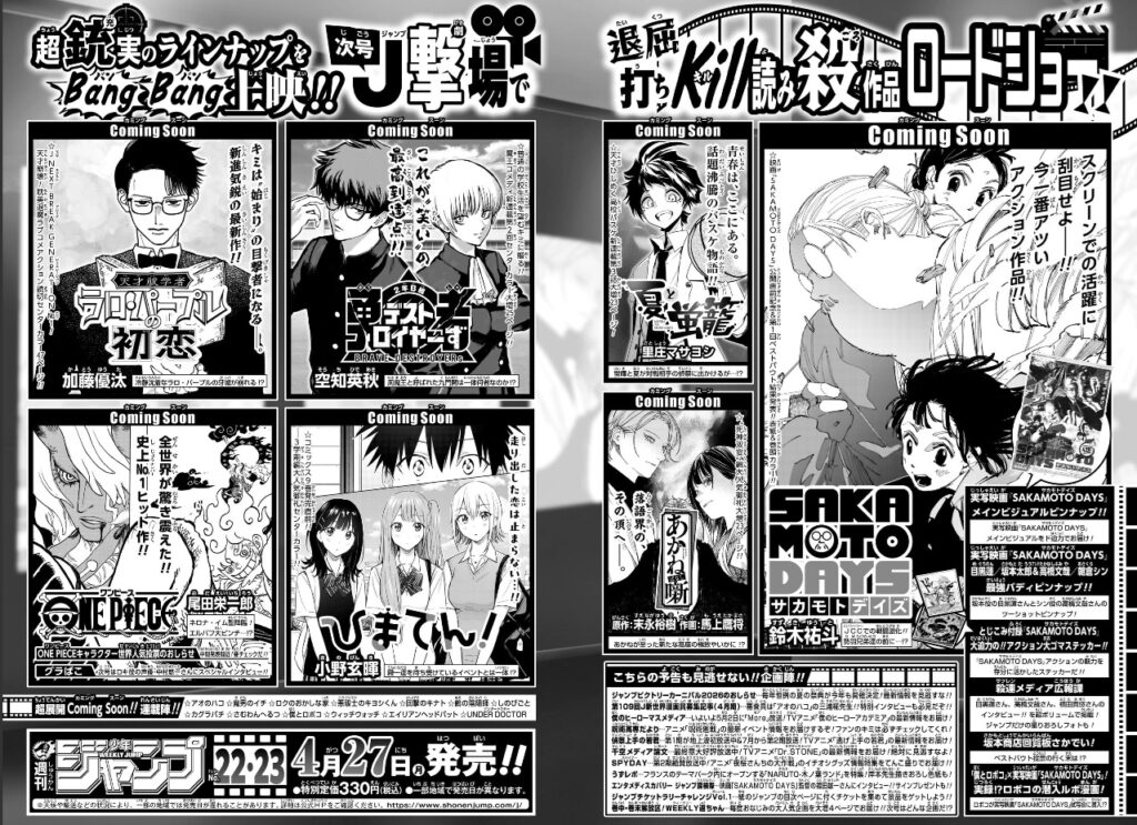 【4/27販売】週刊少年ジャンプについて 漫画・アニメ X Facebook LINE コピー 2026.04.27 4月27日販売の週刊少年ジャンプ22.23号の総評と公開された情報をお話していきます!! 目次 4月27日販売 週刊少年ジャンプ22.23号 情報総評 4月27日販売 週刊少年ジャンプ22.23号 情報 "引用 少年ジャンプ 22.23号より" 新連載「なし」 休載情報「なし」 掲載順SAKAMOTODAYS魔男のイチONEPIECE2年B組 勇者デストロイヤーずさむわんへるつウィッチウォッチ悪払士のキヨシくんカグラバチロクなおかしな家天才祓学者ラロ・パープルの初恋夏と蛍籠あかね噺ひまてん!UNDER DOCTORアオのハコしのびごと僕とロボコ鵺の陰陽師回撃のキナトエイリアンヘッドバッド 総評 "引用 少年ジャンプ 21号より 総評 今週のジャンプは付録がたくさん!SAKAMOTODAYSの実写版公開に伴い、目黒蓮が表紙で、目黒蓮=坂本さんのカラーシールが付録でついています。目黒ファンには堪らない付録ですね! そしてアニメワンピースのロキの声優が「中村悠一」さんです。最強キャラ専用の声優と噂の中村さんの声がまさかのロキでかなりテンションあがります!!これでロキが仲間になれば。。。あの麦わらの一味声優に中村さんが入るの!?www楽しみすぎますね! 今週のおすすめ4作品を紹介します。 『ONEPIECE』 ついにロキVSイム様のバトルが開始されました。イム様の能力がバトルを見ていても謎が多く。。。苦戦をしているロキですが、やっぱりキーマンはジョイボーイなんでしょうか!?今後も目が離せません!! 『あかね噺』 正直、あかねの表現力に脱帽しております。死神という難しいダークな話をユーモアもあり、怖さもあり。。。それを漫画で表現できるあかね噺は本当にすごいです。いよいよ死神編がクライマックスに向かっています。どう展開していくのか、楽しみです。 『ひまてん!』 愛情とは?好きとは?そのことを確認している段階でいろんな女の子の感情に触れている家守。告白まで1か月と期限を決めているが、一人一人と接している中で感情の変化が出てきています。いったい誰と付き合うのだろ。。。ドキドキしますね 『アオのハコ』 今週はザ青春という回です。試合をする中で、お互いの想いがぶつかり合う。。。部活を本気でやってきているからこそわかる気持ちが感動を誘ってきます。勝ち負けがつく勝負の行方は!?必見です!! 今週号もぜひ読んでみてくださーい。